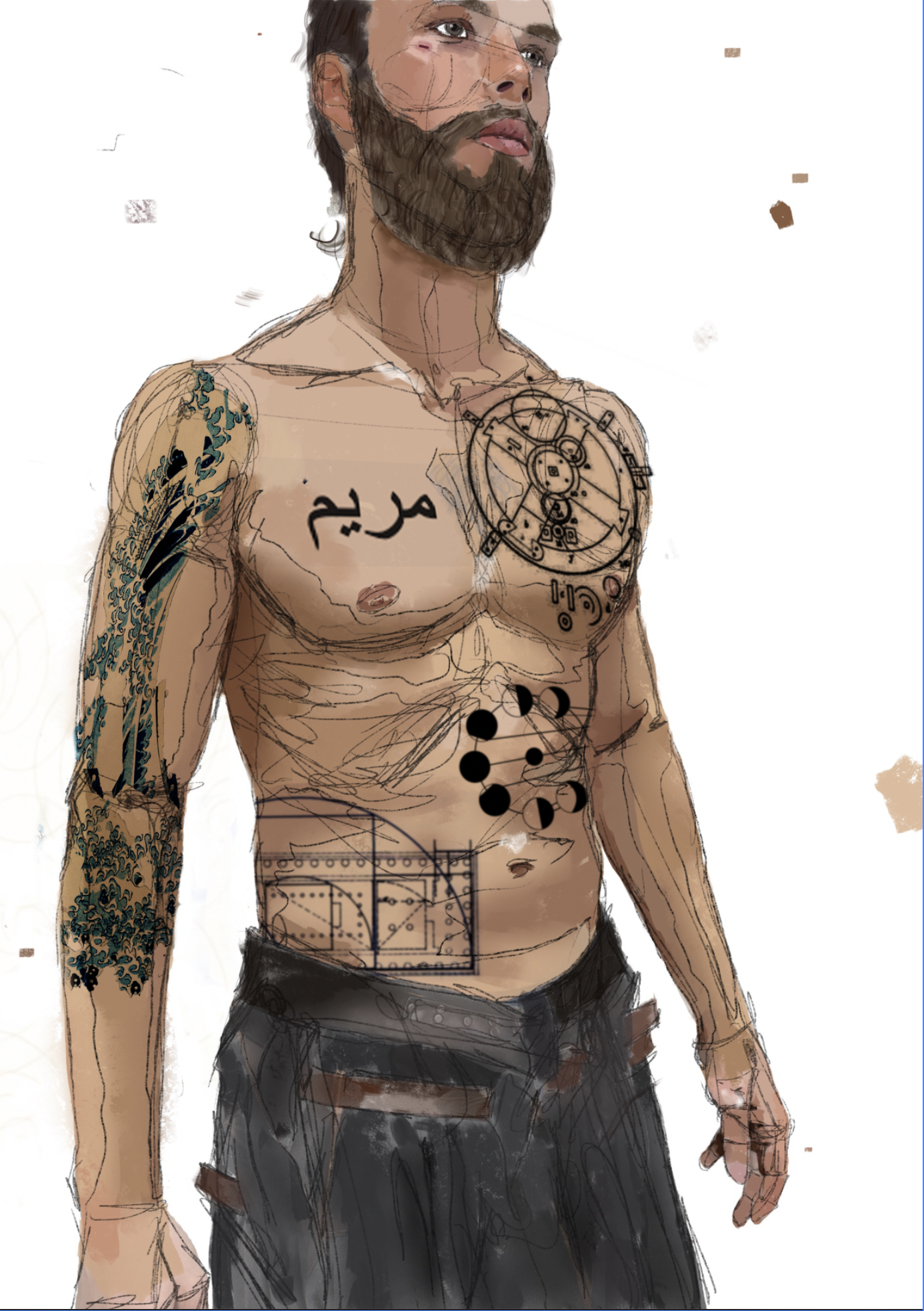 Exploratory artwork, design studies, and experimental visuals created to spark ideas and support storytelling. These works show the early stages of world-building and character design, blending hand-drawn, digital, and AI-assisted methods.