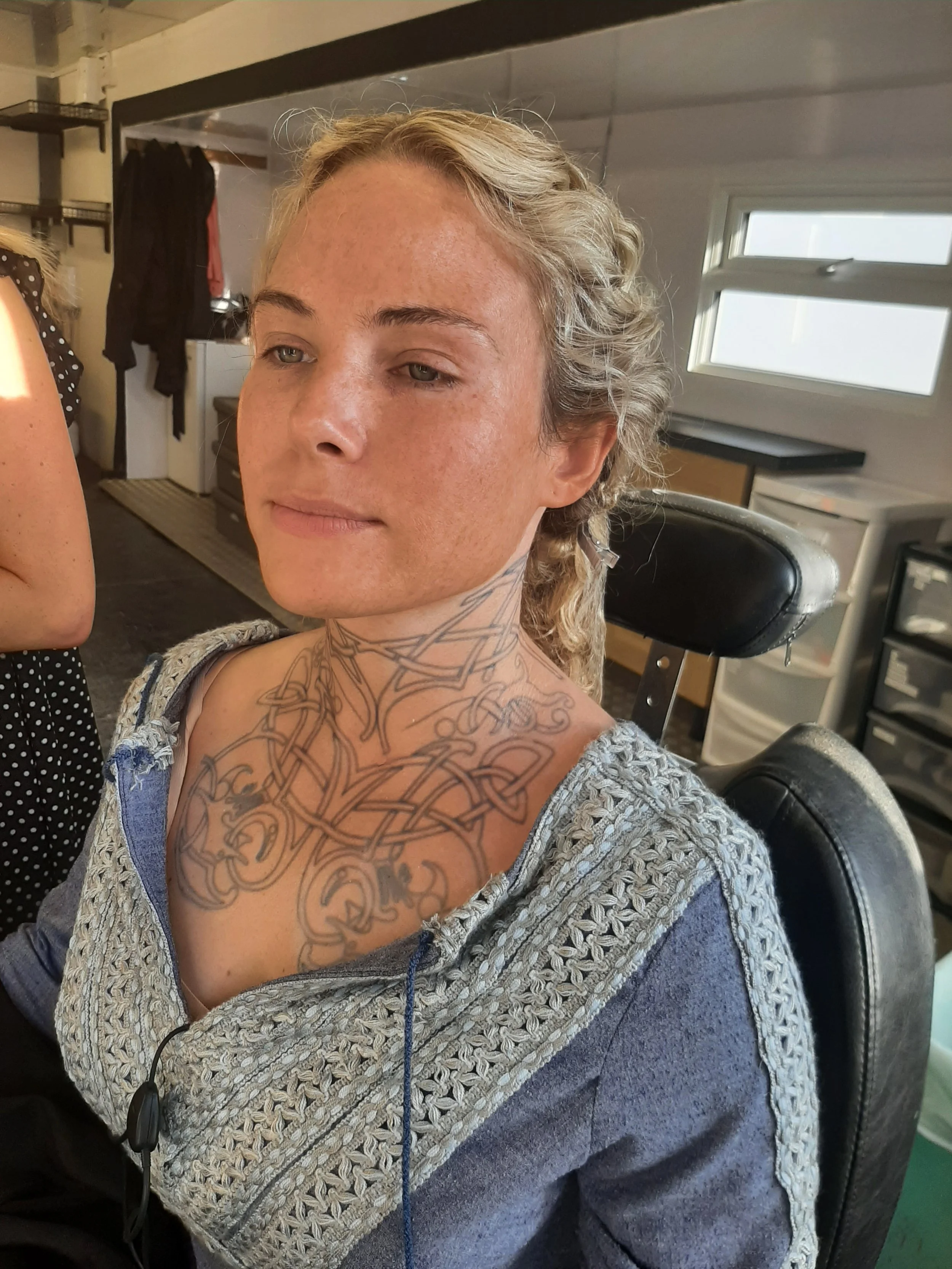 I design and produce custom transfer tattoos and skin FX for film and television, using a mix of traditional hand-drawn illustration and AI-assisted design. This blend of craft and technology allows me to develop pieces that are historically inspired, stylistically consistent, and tailored to the needs of each production. From full-body tattoos to scars, wounds, and other skin effects, every design is made for speed, realism, and continuity on set. Whether applied once or across dozens of shooting days, the transfers are fast, repeatable, and always camera-ready.